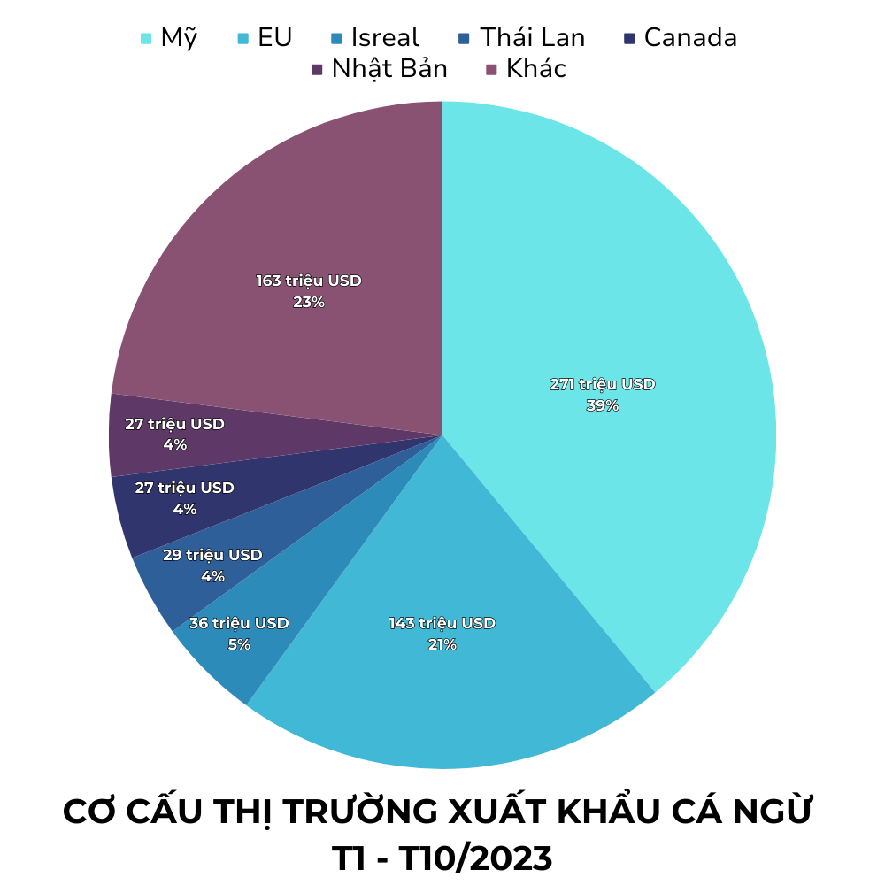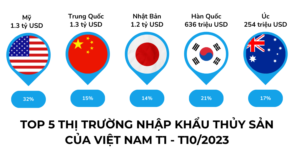 Cũng theo VASEP, đến cuối tháng 10/2023, xuất khẩu thủy sản của Việt Nam sang ba thị trường lớn nhất bao gồm Mỹ, Trung Quốc và Nhật Bản đã vượt qua mốc 1 tỷ USD. Trong số đó, Mỹ vẫn đứng đầu với khoảng 1,3 tỷ USD, giảm 32% so với cùng kỳ năm 2022. Thị trường Trung Quốc đã mang về cho ngành thủy sản Việt Nam khoảng 1,3 tỷ USD trong ba quý đầu năm, giảm 15%. Trong khi đó, Nhật Bản nhập khẩu thủy sản từ Việt Nam với giá trị gần 1,2 tỷ USD, giảm 14% so với cùng kỳ năm trước.