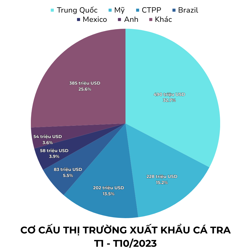 Trong tháng 10, Trung Quốc tiếp tục là thị trường hàng đầu nhập khẩu cá tra của Việt Nam và đã ghi nhận mức tăng trưởng tích cực. Giá trị xuất khẩu cá tra đạt khoảng 56 triệu USD, tương đương với tháng trước đó và tăng 15% so với cùng kỳ năm trước. Tuy nhiên, tính đến hết tháng 10, xuất khẩu cá tra sang thị trường này vẫn giảm 23%, đạt hơn 490 triệu USD.