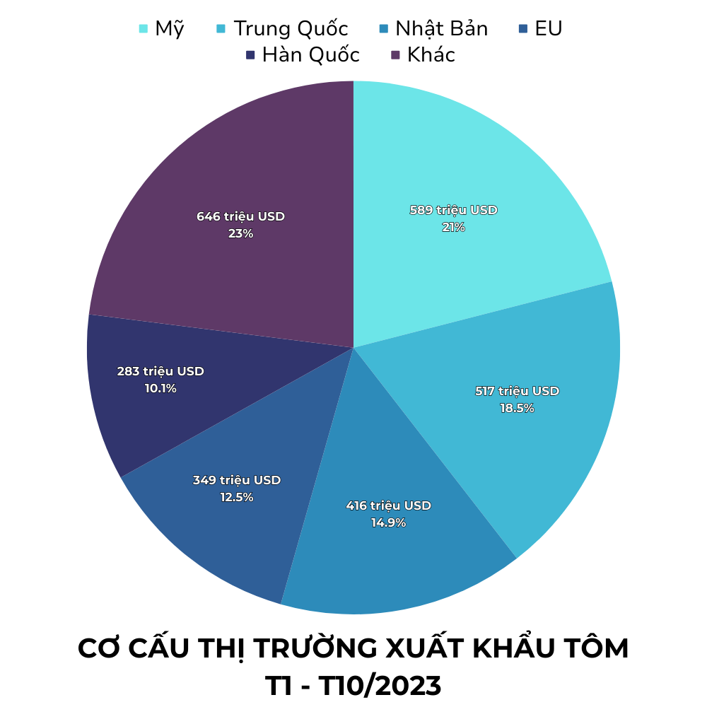 Theo thông tin từ VASEP, kim ngạch xuất khẩu tôm tính đến cuối tháng 11/2023 ước đạt 3,15 tỷ USD, giảm 22% so với cùng kỳ năm trước. Xuất khẩu tôm cũng đang chịu ảnh hưởng của sự cạnh tranh về giá do dư thừa nguồn cung tôm trên toàn cầu, dẫn đến giá bán giảm. Xuất khẩu tôm sang hầu hết các thị trường chính đều giảm so với cùng kỳ, trừ một số thị trường nhỏ như Hongkong và Thụy Sỹ tăng 5%, và Đài Loan tăng 19%.